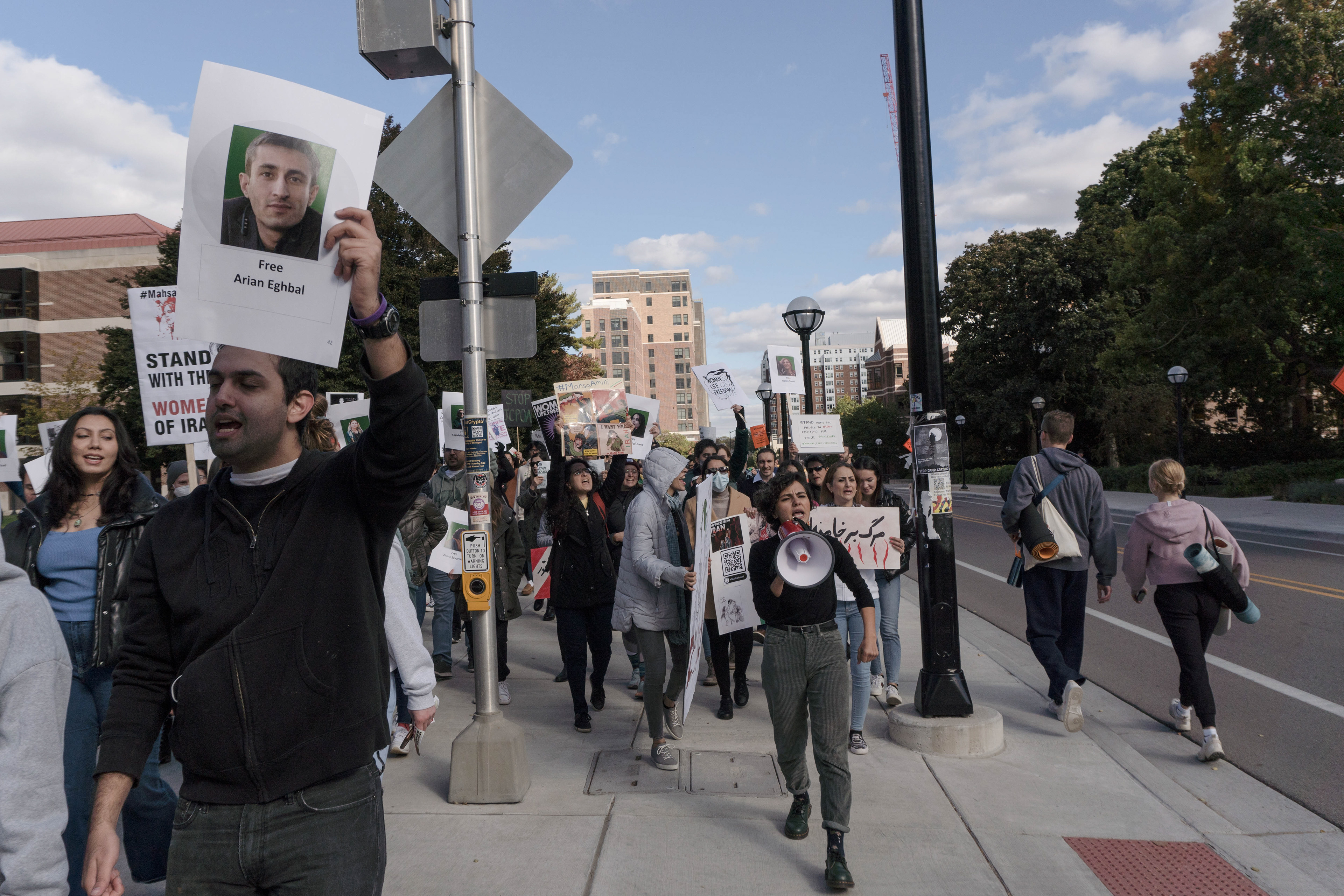 Samin Aayanifard (28), a graduate student at Michigan State University, leads the chant when the protesters march down the University Avenue in Ann Arbor, Michigan, on October 8, 2022. The protest in solidarity with Iranian women was organized by the Iranian student associations at Michigan State University and University of Michigan.