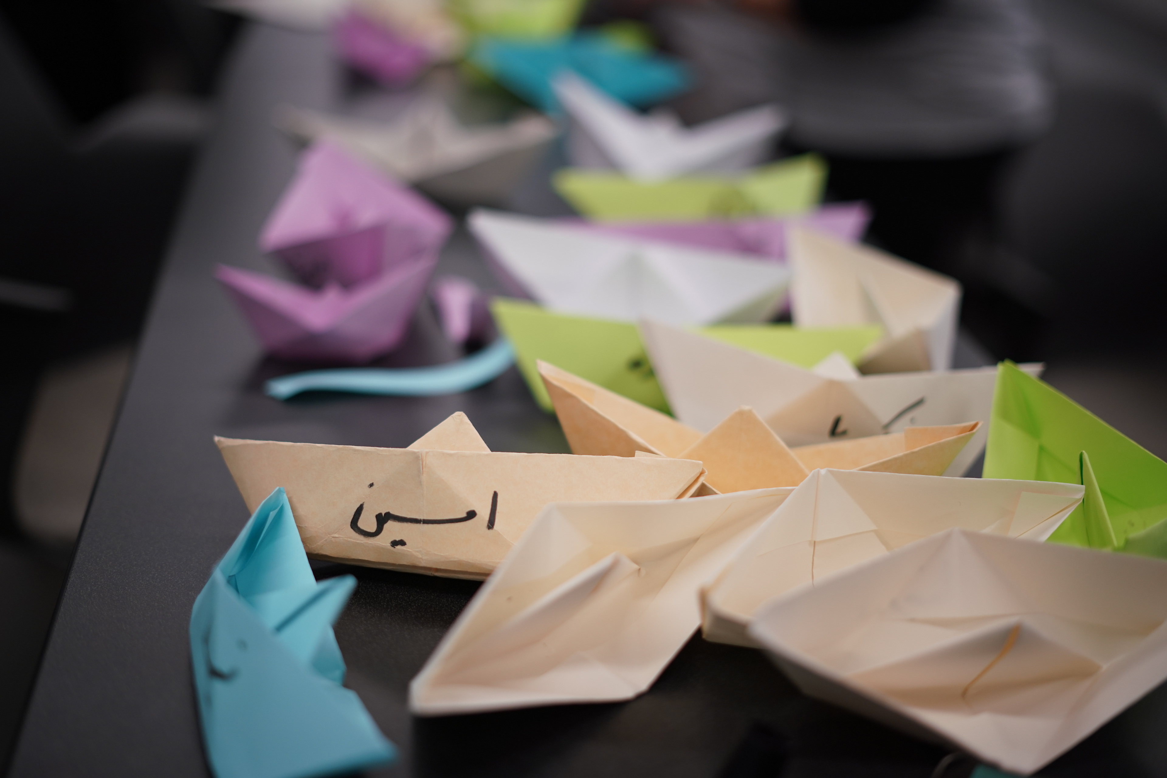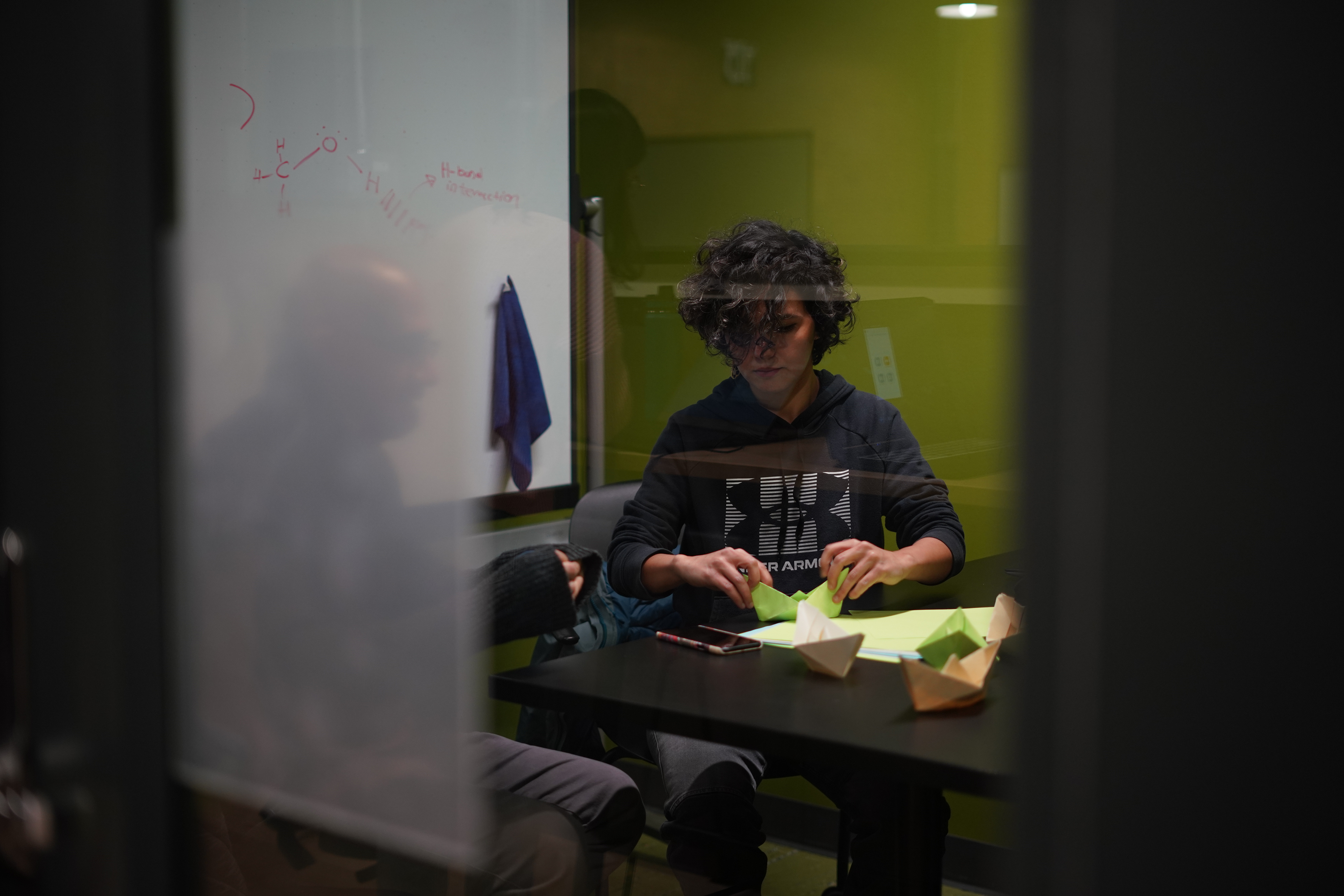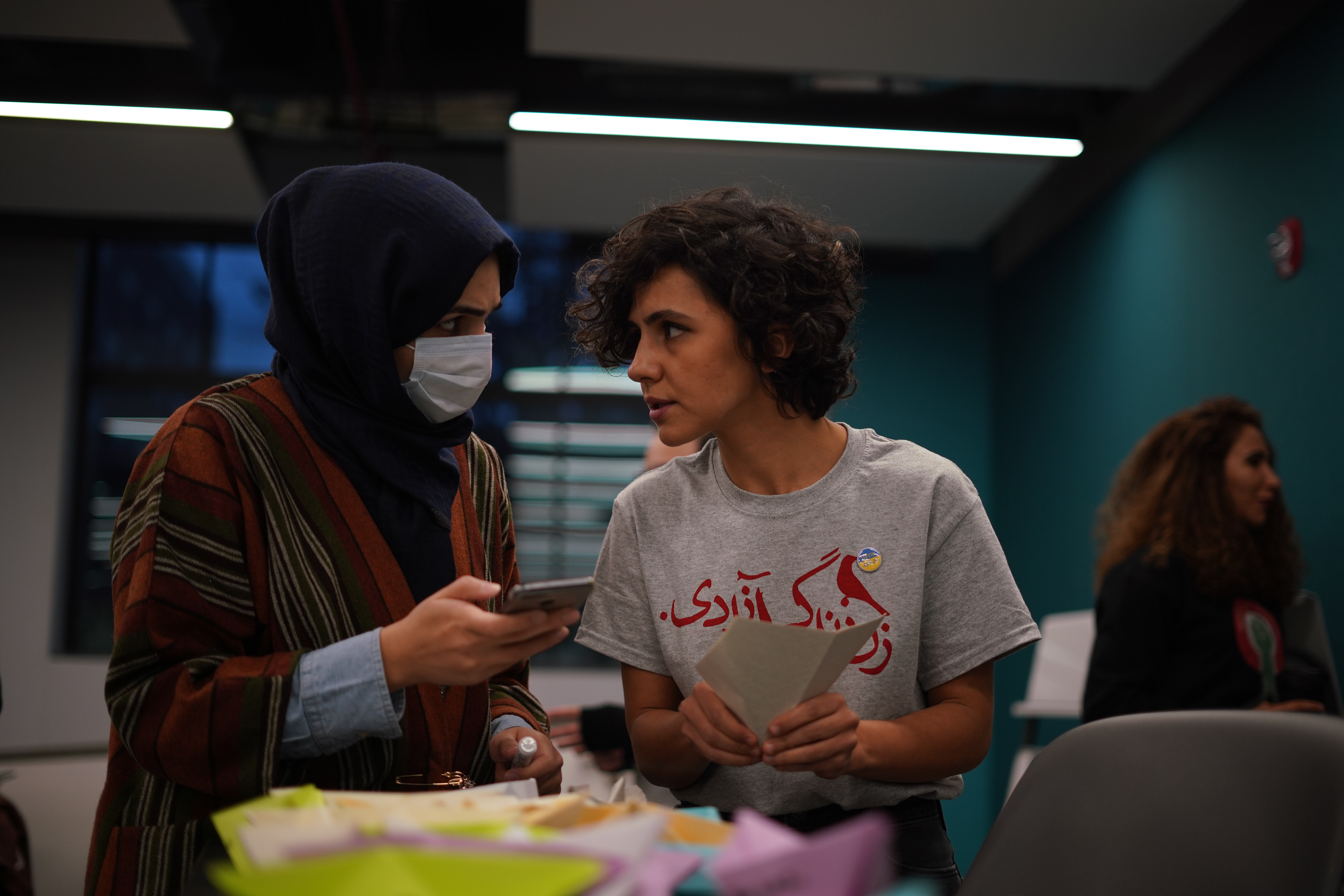 Aayanifard and other organizers prepare for the Campus Rally for Iran at Michigan State University on November 30, 2022. More than 200 universities worldwide joined the initiative and held campus rallies in support of Iranian people fighting for freedom. Aayanifard is making paper boats meant to symbolize the lost lives of Iranian protesters, who were killed by the Islamic regime.