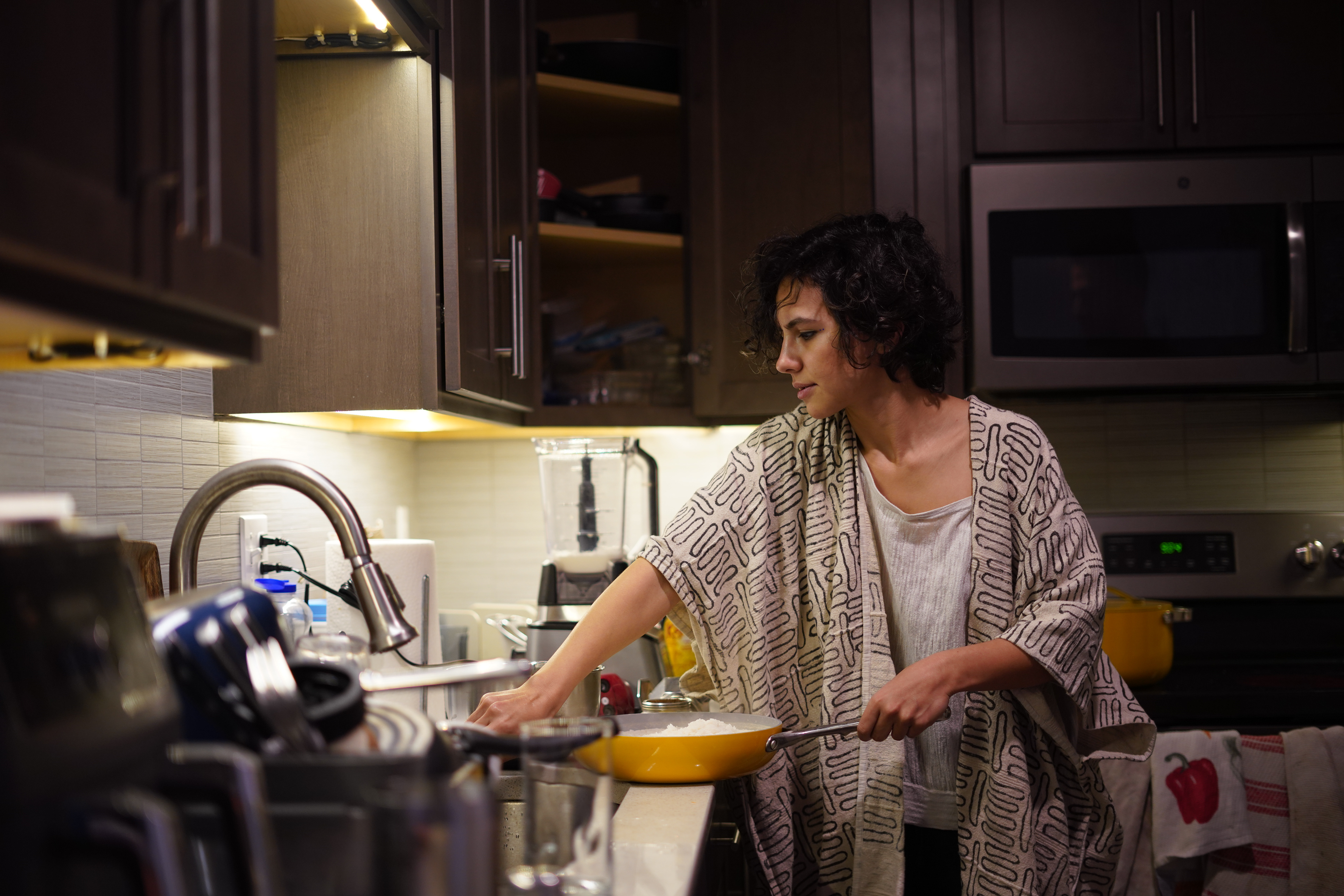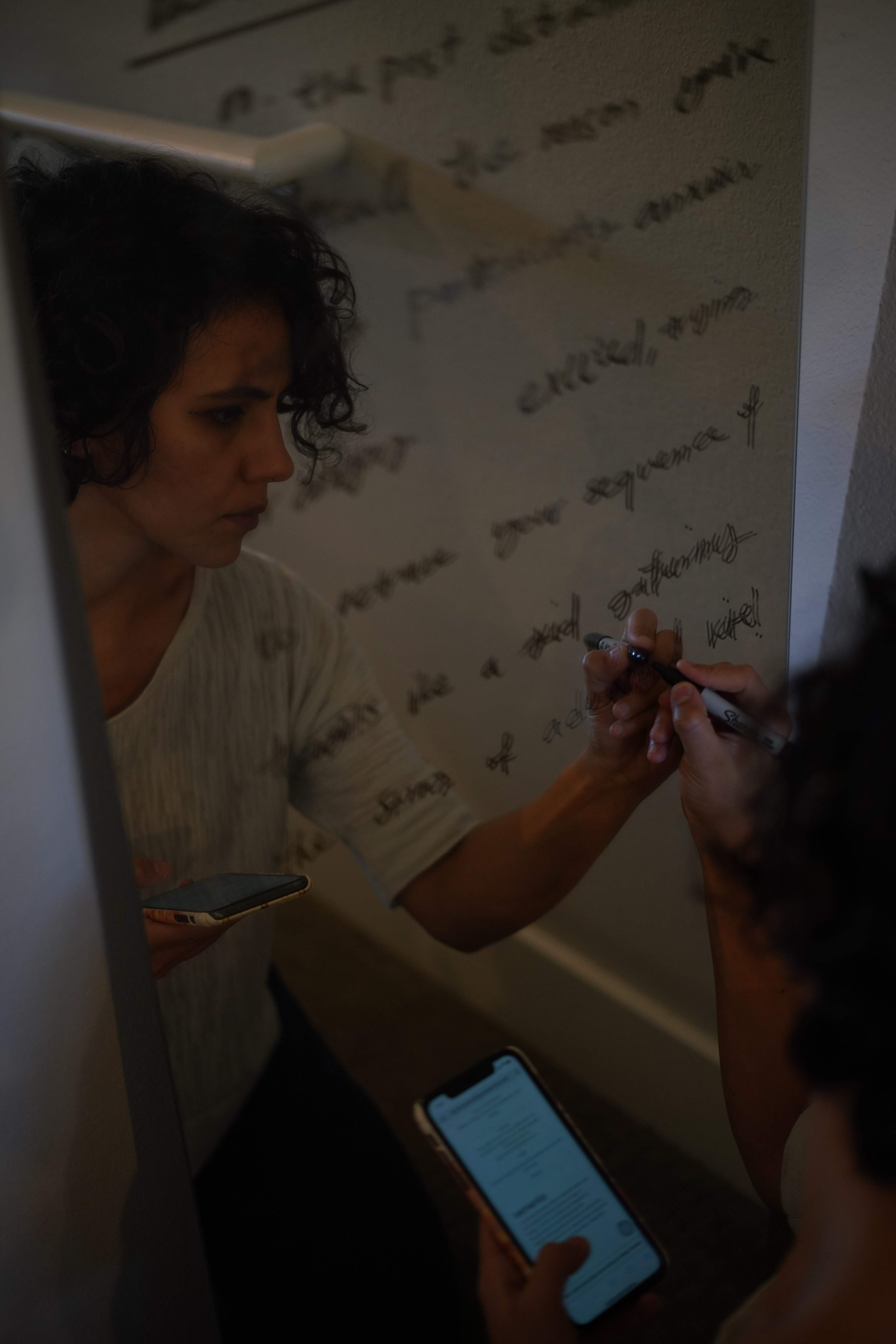 Samin reenacts the performance they did on Michigan State University campus soon after the news about Jina (Mahsa) Amini’s death broke out. They tied black thread around their neck and used it to embroider the face of Jina (Mahsa) Amini. “I want to show that I am trying to open the chains of the Islamic Republic. But at the same time, I want to show that there is a bigger cage around me, which is patriarchy,” Samin said.