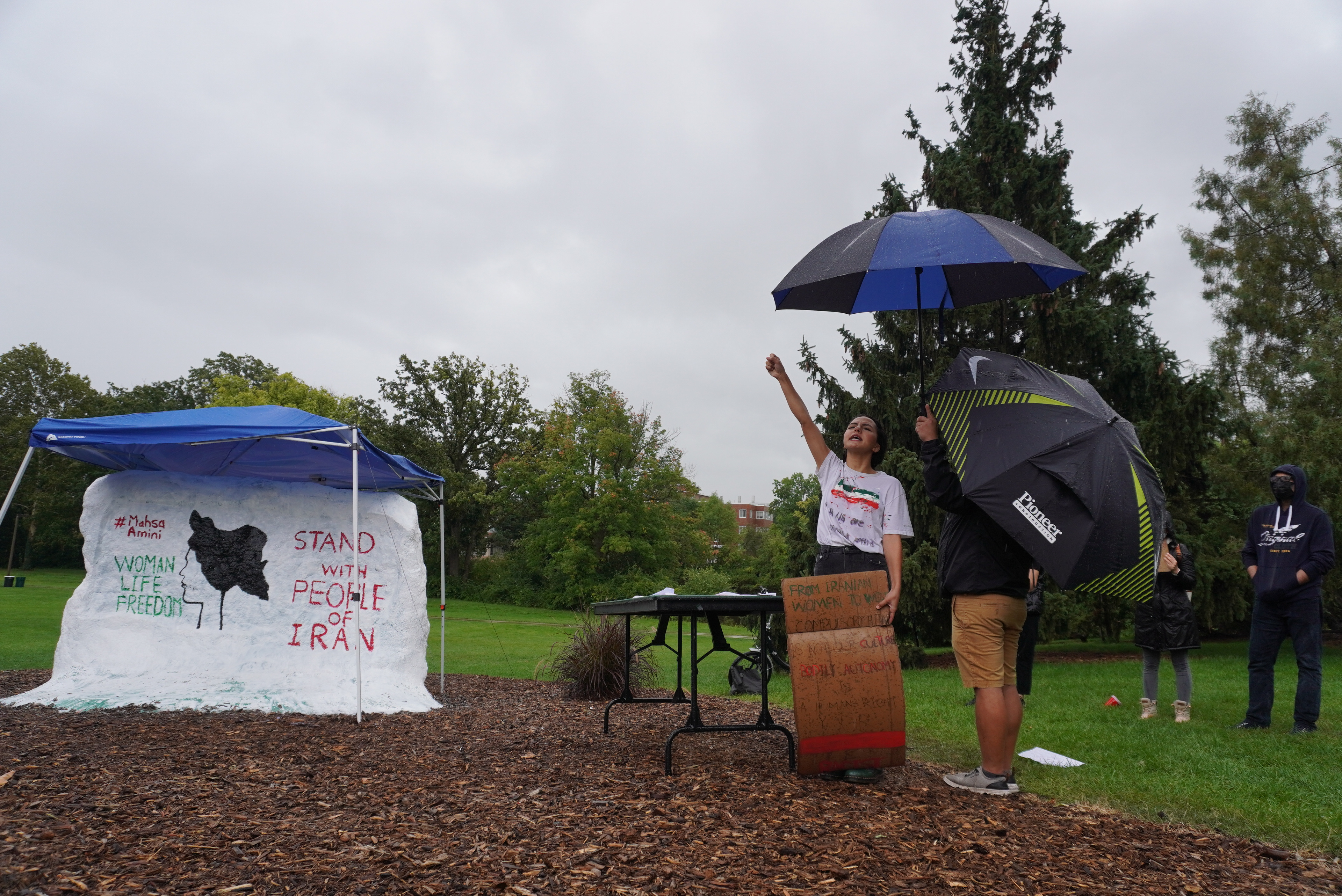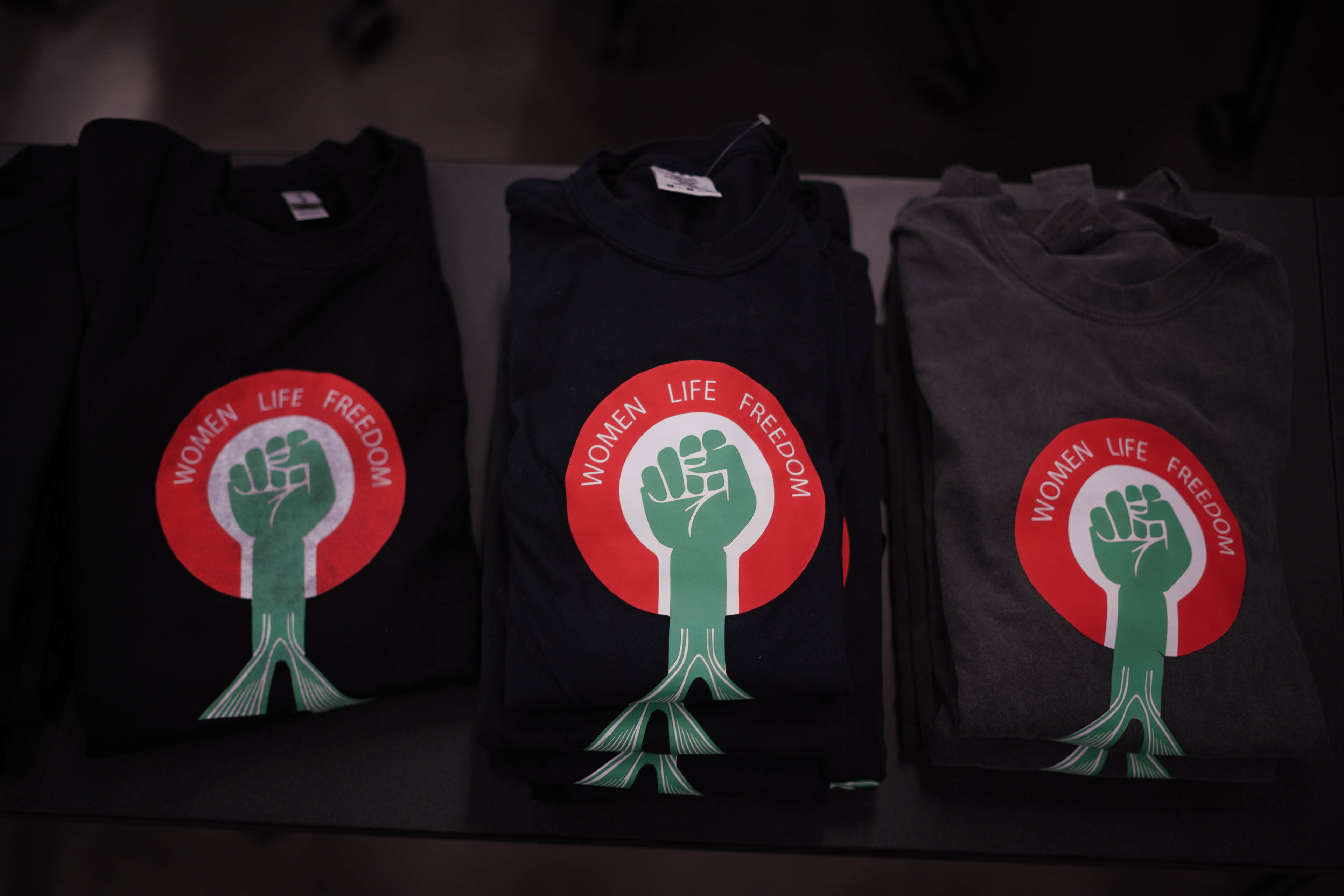 Iranian Student Association brought "Women Life Freedom" T-shirts for participants to purchase at the Campus Rally for Iran at Michigan State University.