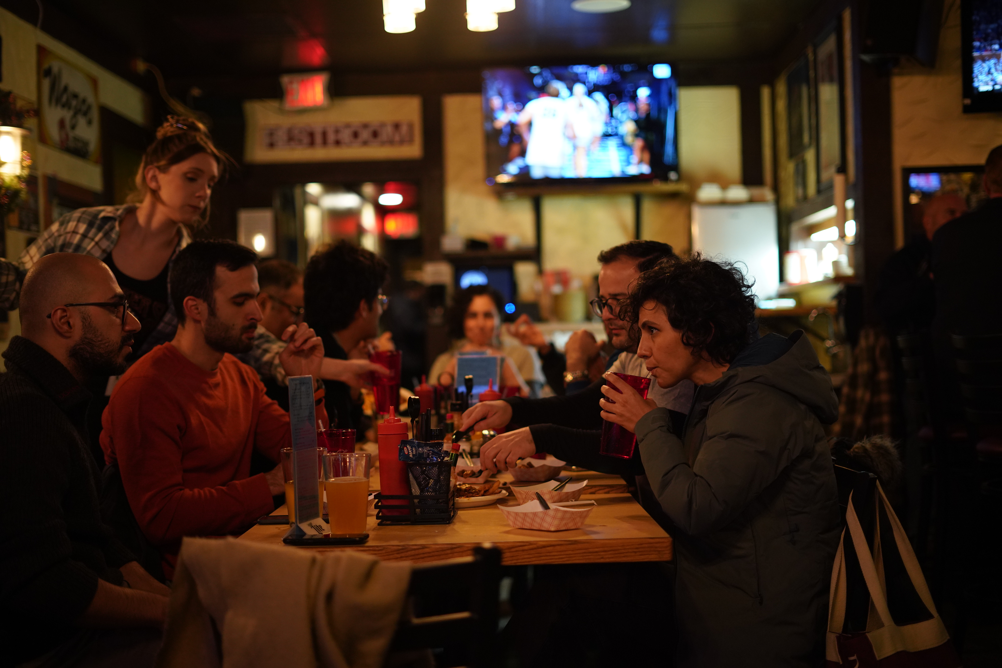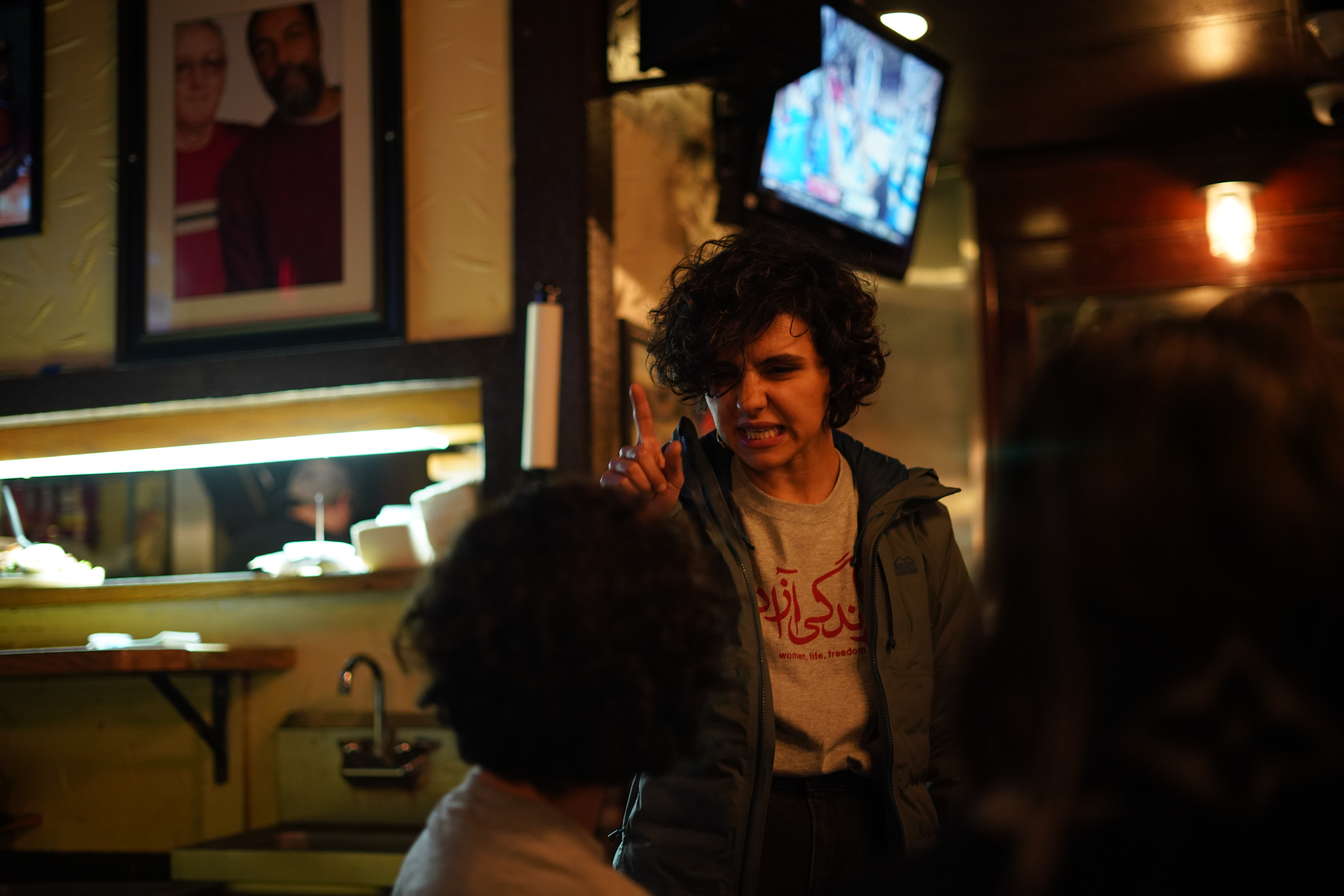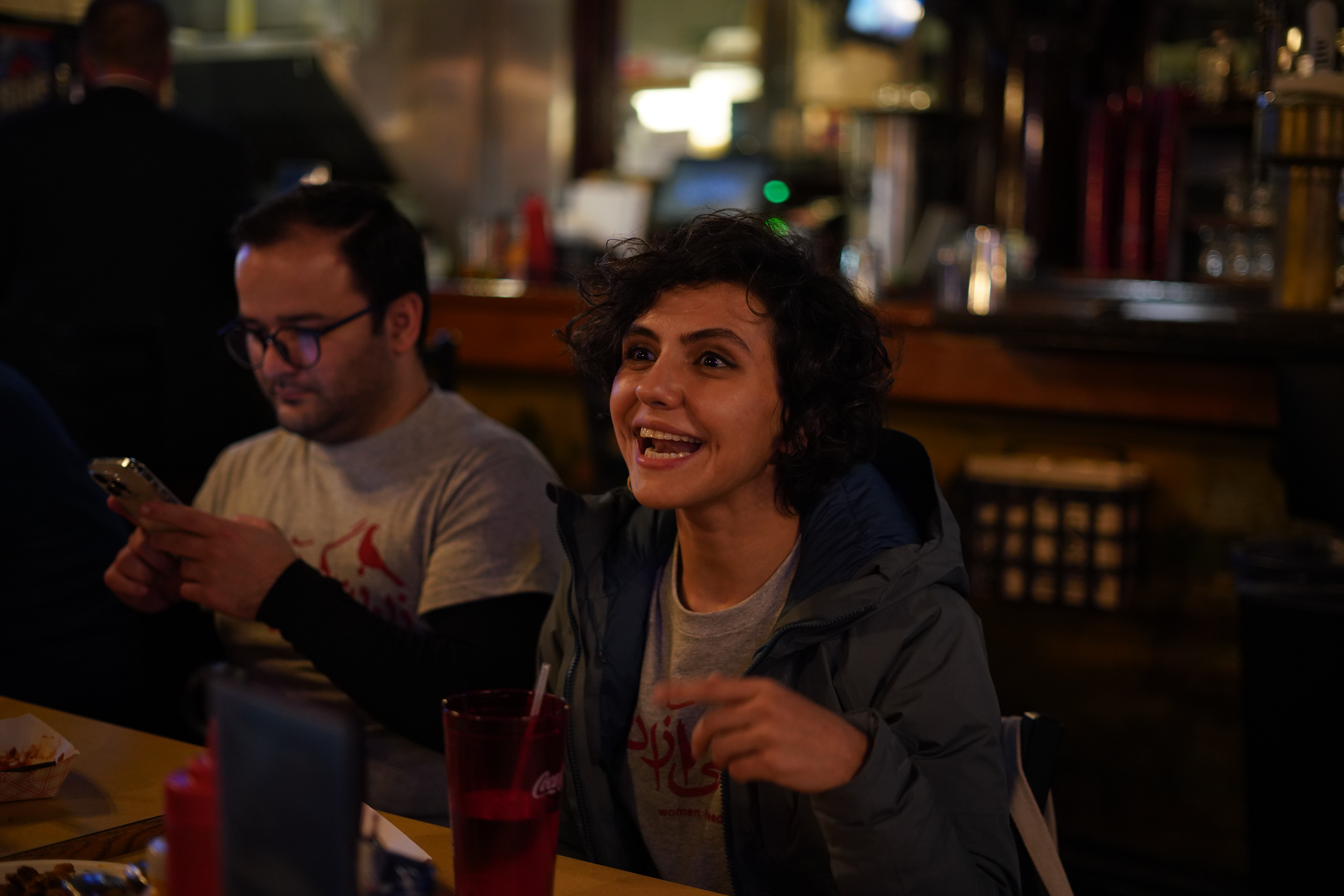 Aayanifard joins other Iranians who helped organize the Campus Rally for Iran at Michigan State University for dinner at a bar after the event.