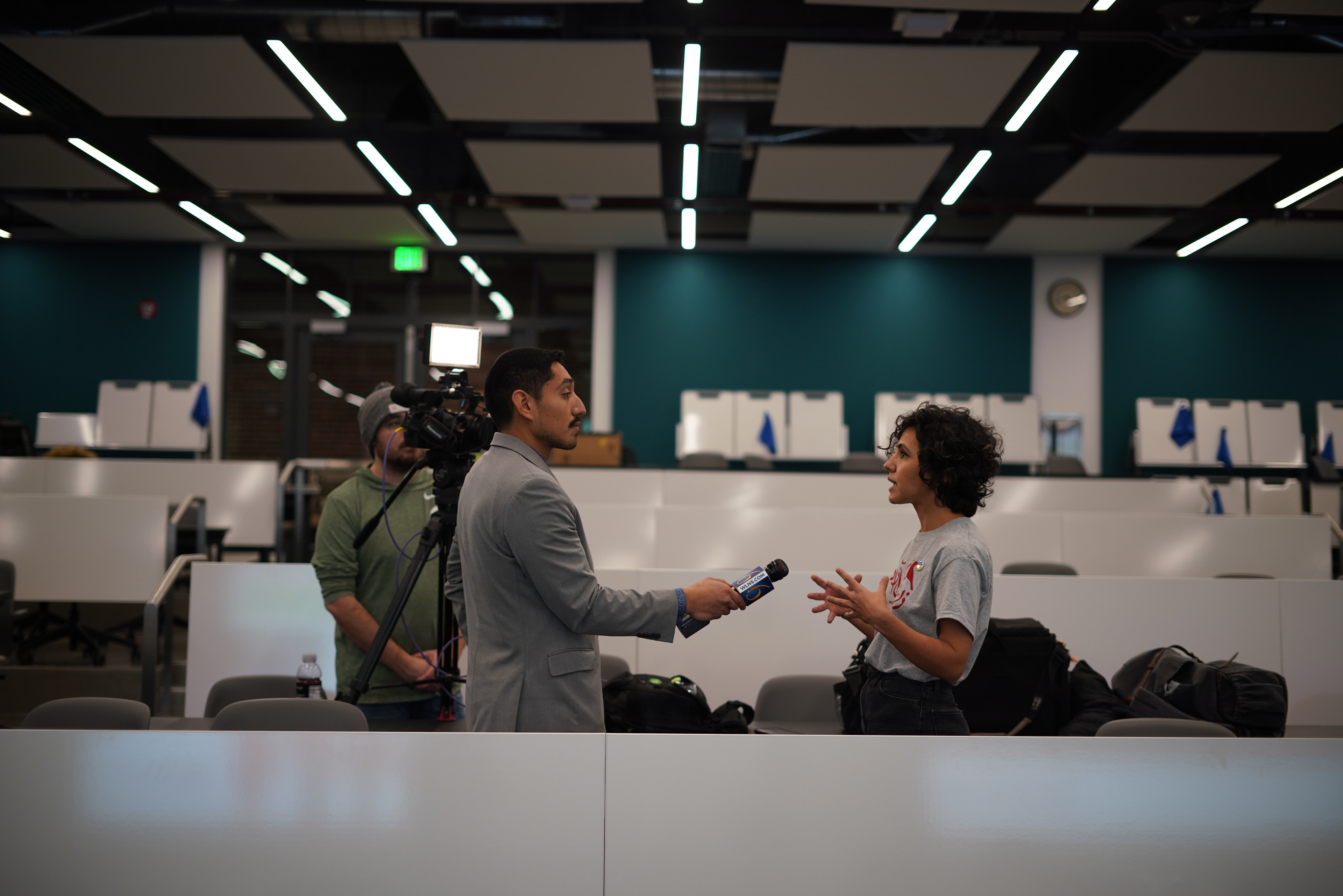 Before the start of the Campus Rally for Iran at Michigan State University, Aayanifard is being interviewed by journalists from WLNS 6, a local television station in Lansing, Michigan, United States, affiliated with CBS.