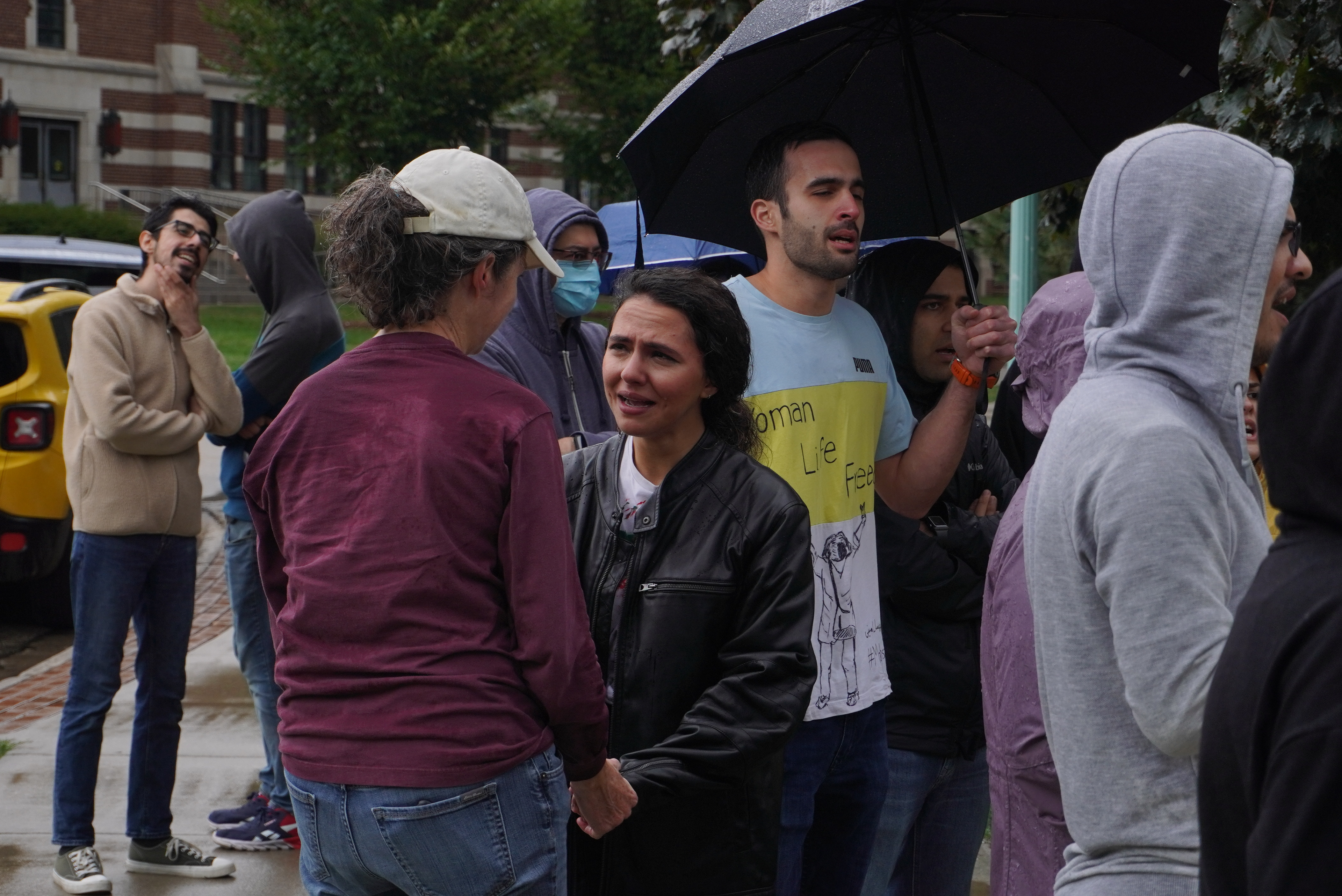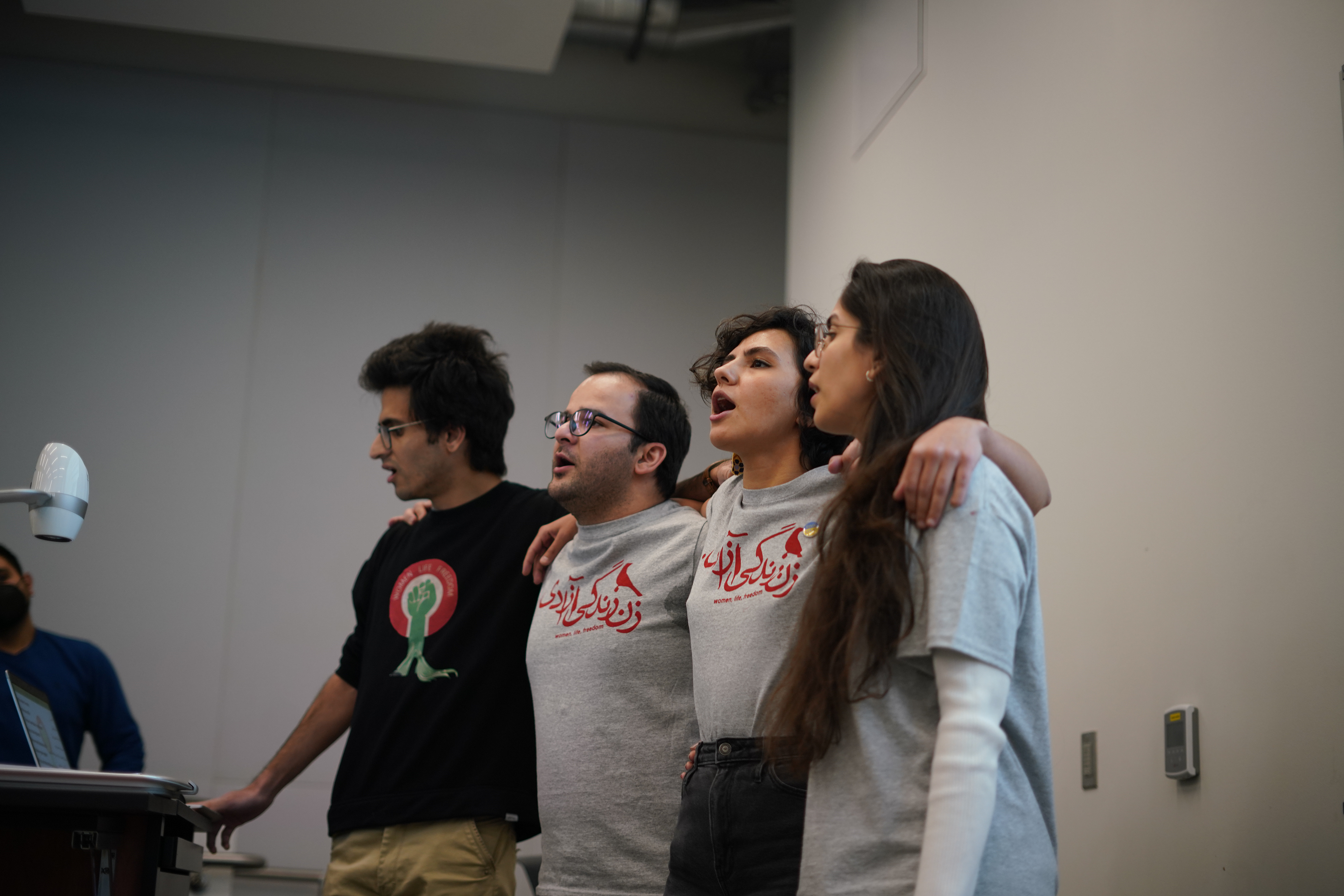 Aayanifard and other organizers of the Campus Rally for Iran at Michigan State University hug each other while singing the Iranian protest song “Baraye,” which means “because of” in Farsi. The song was written by Shervin Hajipour, who composed the lyrics using messages that Iranians posted online about why they are protesting.